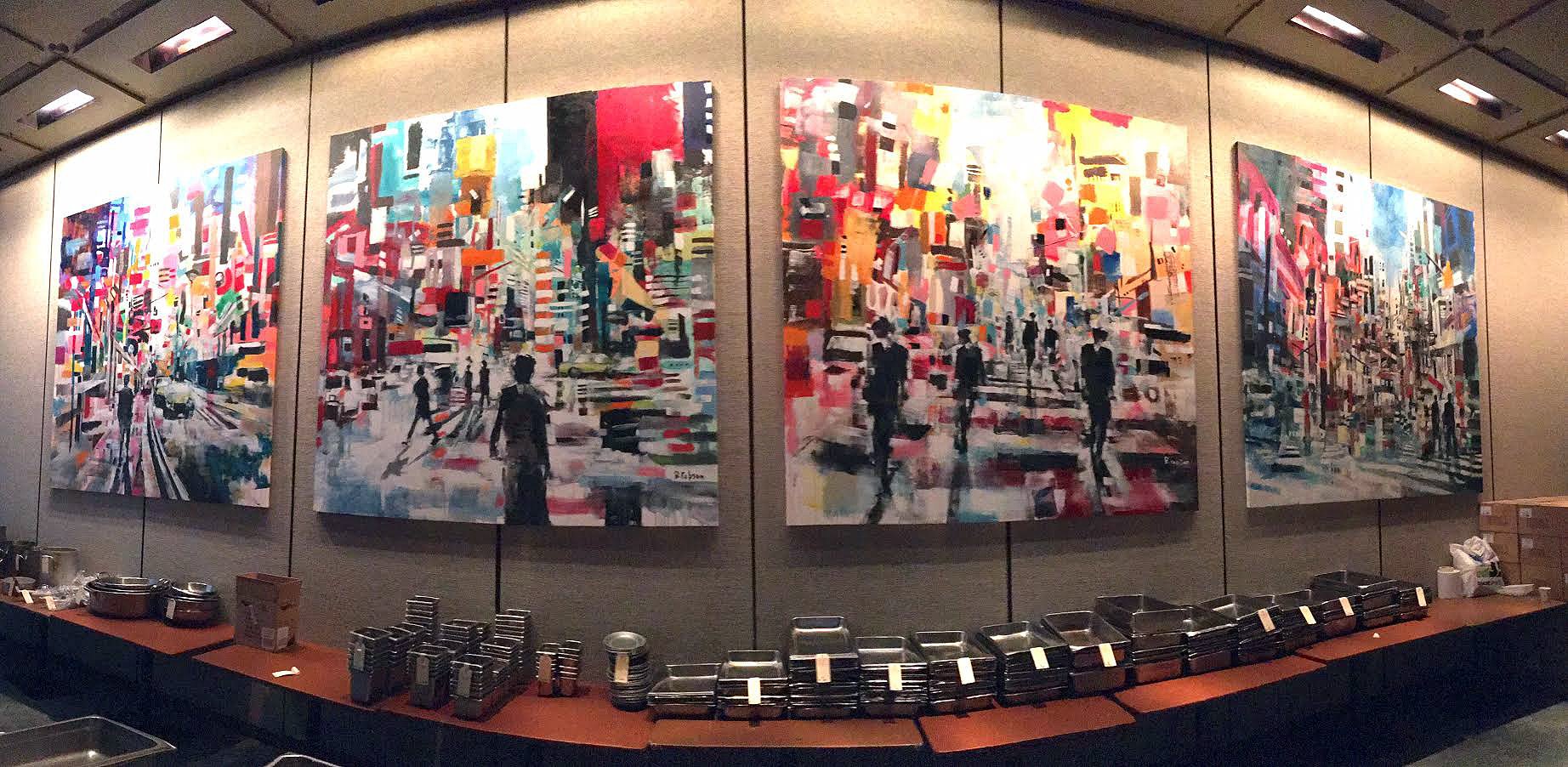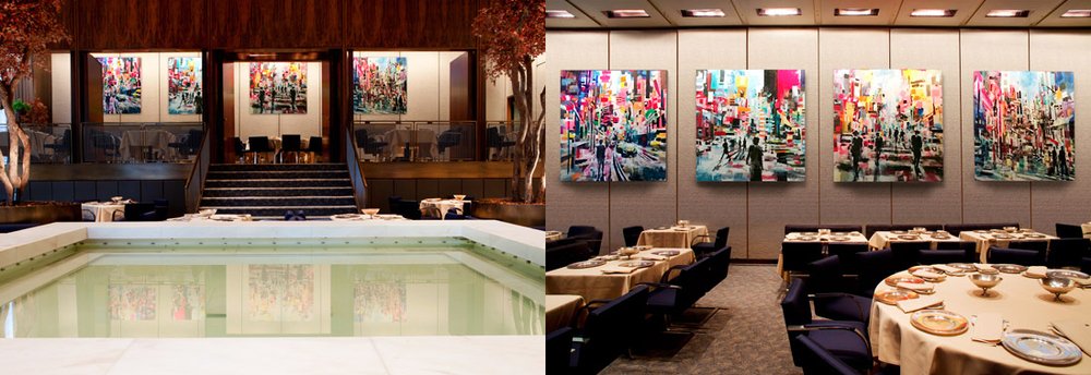 (The Four Seasons Restaurant was the Midtown landmark dining spot in the Seagram building for power brokers, celebrities and well-to-do tourists from 1959 - 2016. Jackson Pollock, Andy Warhol, Robert Rauschenberg, Robert Indiana, Pablo Picasso, Red Grooms, and Richard Hambleton are among the famous Artists to exhibit on their walls. John Woodward, Woodward Gallery was their Art Curator from 2008- 2016.)