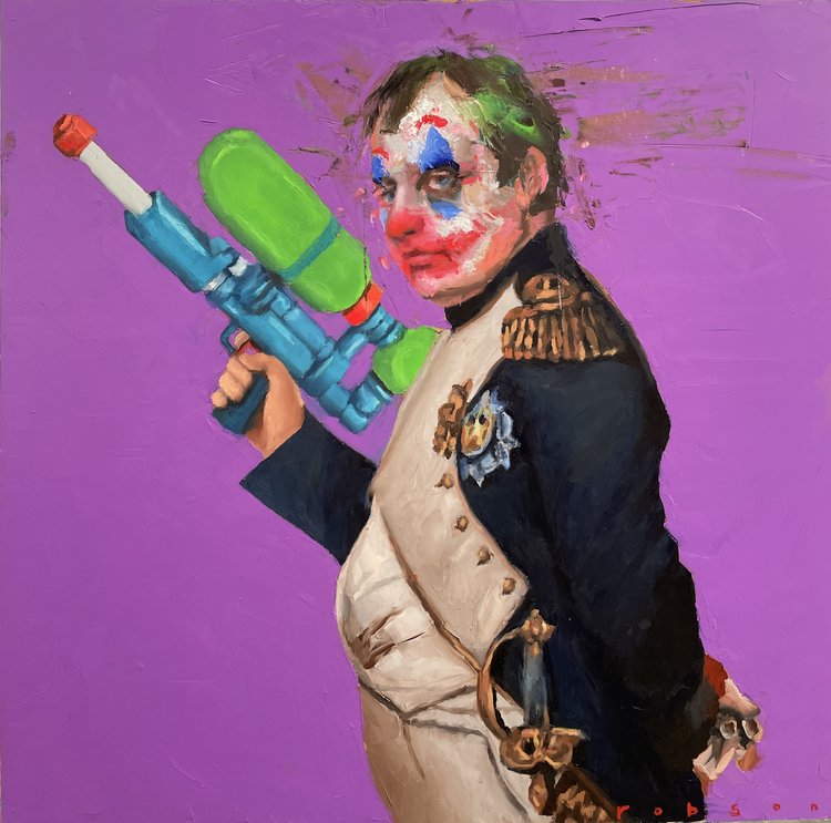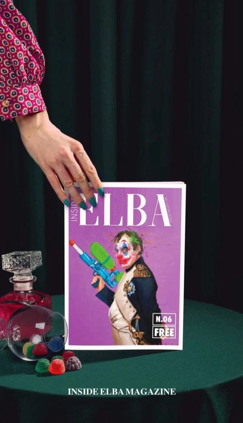 "Ridi, Bonaparte ridi" is the artwork I created for the cover of Inside Elba Magazine. My intent was to ridicule wars and to play with the stereotype of a megalomaniac Napoleon by replacing him with a mocking figure hid-den behind a mask. The clown I referenced is the Joker by Todd Phillips. This character is a conspiracy obsessed madman, delusional and childish, who resorts to violence. So I brought the legend of the past into the present day - but in my artwork the gun only shoots water and wars are revealed as the senseless obsession of madmen.