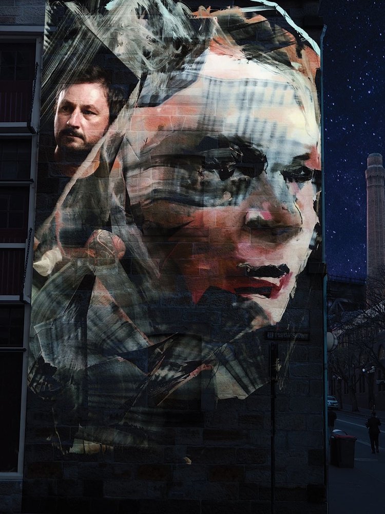 A form appears on a sandstone wall as light is painted onto the honey-hued rock. Rich, fluid colours appear from the darkness, revealing an artist at work, as seen through the canvas. As distinct features emerge out of these flowing brushstokes, contours resolve into striking portraits. As the first light installation to be projected on the facade of 47 George Street, this Esem Projects’ collaboration captures local artist Brad Robson in the process of creating his vivid, dynamic portraits. His style is bold and gestural. These colourful, painterly works reveal significant figures from Sydney’s past – some well-known, others who should be more recognised. Each face is rendered both unique and ethereal, their impressions on this Sydney landscape transitory, always in motion. The installation takes the concept of mural painting and celebrates the process as much as the finished work. Point of View reveals both the medium and the act of painting as a dynamic, visceral experience of creative dialogue between artist and onlooker. Multiple viewpoints converge – between artist, subject, and audience – on both sides of a virtual canvas.